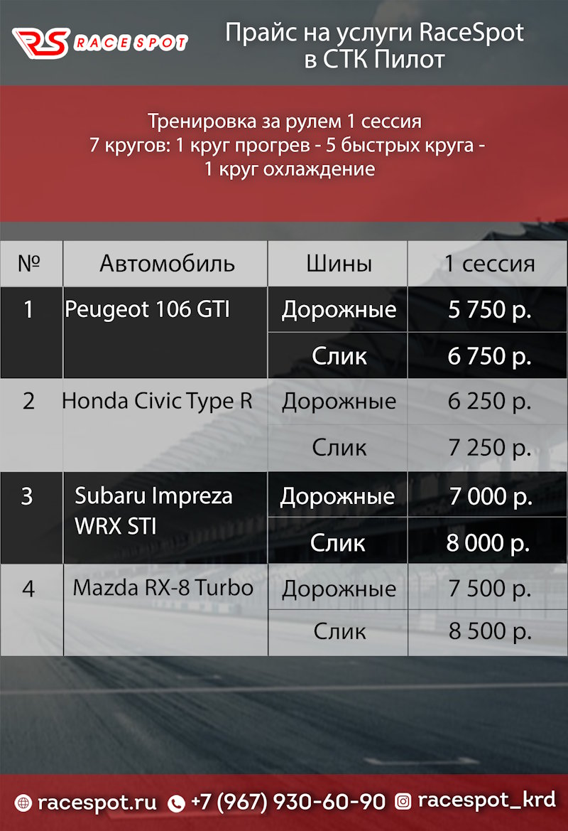 Race Spot предоставляет возможность тренироваться за рулем спортивных автомобилей, занимающих призовые места в этапах Чемпионатов Краснодарского края по ралли, горным гонкам и time-attack.Участник проезжает несколько кругов по Трассе за рулем выбранного спортивного автомобиля с целью усовершенствования навыков вождения.